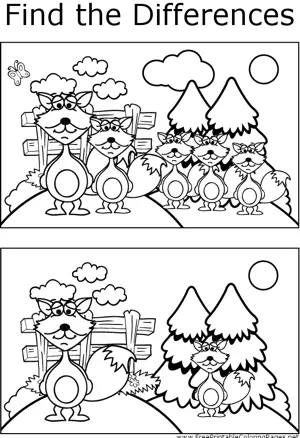 FTD Foxes Printable Coloring Page, free to download and print. A number of differences can be found between the two pictures of foxes standing in a field by a fence.