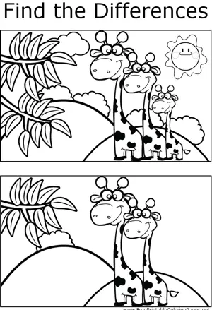 FTD Giraffes Printable Coloring Page, free to download and print. Teachers can use this printable coloring page to help students spot the differences between two pictures of happy giraffes.