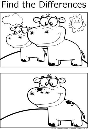 FTD Hippo Printable Coloring Page, free to download and print. Find the differences between the two pictures in this printable coloring page featuring a smiling hippo under the sun.