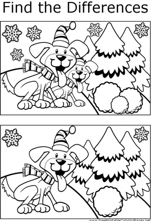 FTD Holiday Puppies Printable Coloring Page, free to download and print. Great for quiet activities and art, this printable coloring page shows several differences between the two pictures of happy, panting puppies in holiday gear.