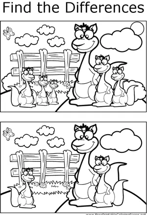 FTD Kangaroos Printable Coloring Page, free to download and print. Hone your observation skills by finding the differences between the two pictures of a kangaroo family in this printable coloring page.