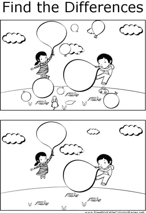 FTD Kids Blowing Up Balloons Printable Coloring Page, free to download and print. There are several differences that can be found between the two pictures of a boy and girl blowing up balloons in this printable coloring page for children.