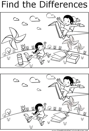 FTD Kids and Origami Printable Coloring Page, free to download and print. Observant students will notice several differences between the two pictures of kids playing with origami paper shapes in this printable coloring page.