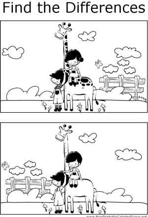FTD Kids on Giraffe Printable Coloring Page, free to download and print. Teachers can use this printable coloring page to help students spot the differences between two pictures of kids riding a giraffe.