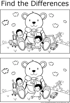 FTD Kids with Teddy Bear Printable Coloring Page, free to download and print. Find the differences between the two pictures in this printable coloring page featuring a boy and girl playing with a giant teddy bear.