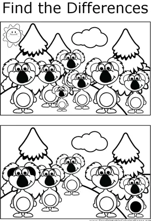 FTD Koalas Printable Coloring Page, free to download and print. Observant students will notice several differences between the two pictures of happy, standing koalas in this printable coloring page.