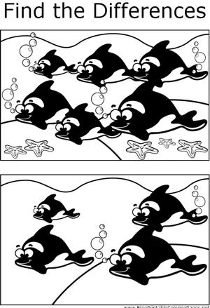 FTD Orca Printable Coloring Page, free to download and print. A number of differences can be found between the two pictures of a pod of orca swimming through the sea.