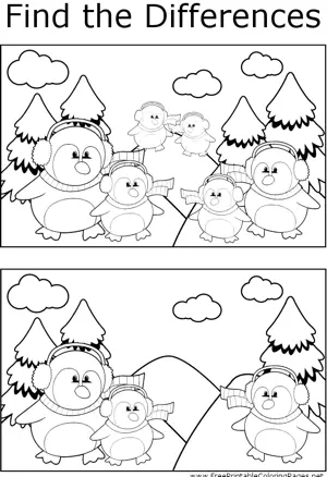 FTD Penguins with Earmuffs Printable Coloring Page, free to download and print. The two scenes of warmly-dressed penguins depicted in this printable coloring page have several key differences that can be found.