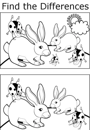 FTD Rabbits and Ladybugs Printable Coloring Page, free to download and print. A number of differences can be found between the two pictures of ladybugs doing handstands on rabbits' backs.