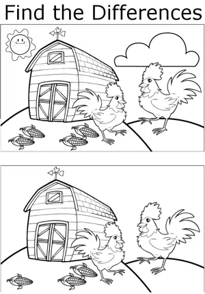 FTD Roosters and Corn Printable Coloring Page, free to download and print. Teachers can use this printable coloring page to help students spot the differences between two pictures of roosters and corn on a farm.