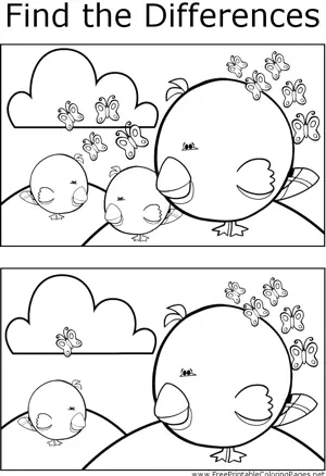 FTD Round Birds Printable Coloring Page, free to download and print. Great for quiet activities and art, this printable coloring page shows several differences between the two pictures of round birds and butterflies.