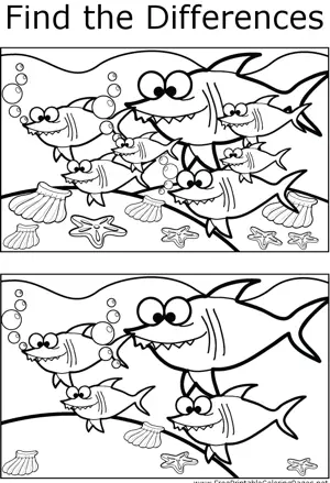 FTD Shark Printable Coloring Page, free to download and print. Find the differences between the two pictures in this printable coloring page featuring a happy shark with sharp fangs.