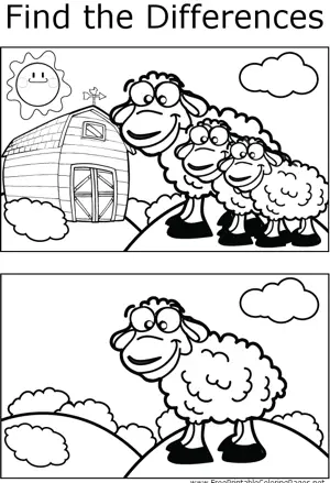 FTD Sheep Printable Coloring Page, free to download and print. A number of differences can be found between the two pictures of sheep standing on a farm.