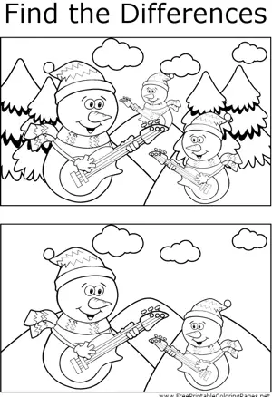 FTD Snowmen Playing Guitars Printable Coloring Page, free to download and print. The two scenes of snowmen playing guitars depicted in this printable coloring page have several key differences that can be found.