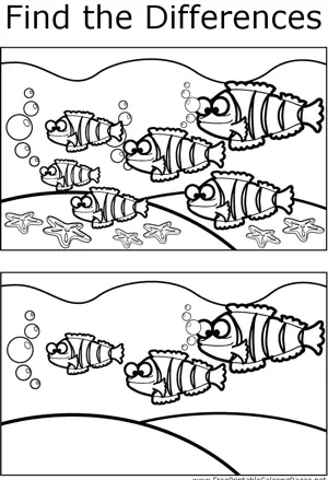 FTD Striped Fish Printable Coloring Page, free to download and print. A number of differences can be found between the two pictures of a school of striped fish swimming through the ocean.