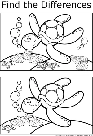 FTD Swimming Turtle Printable Coloring Page, free to download and print. Teachers can use this printable coloring page to help students spot the differences between two pictures of a swimming turtle.