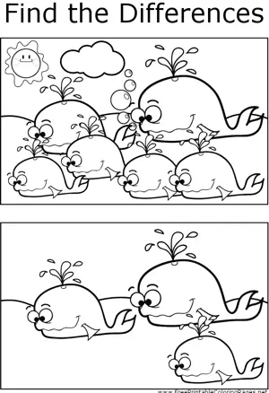 FTD Whales Printable Coloring Page, free to download and print. Hone your observation skills by finding the differences between the two pictures of spouting whales in this printable coloring page.