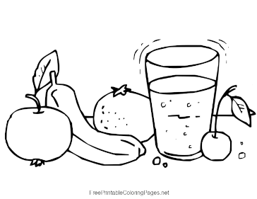 Juice And Fruit Printable Coloring Page, free to download and print. Color a healthful meal including a glass of juice, an apple, a banana, an orange, and a cherry.