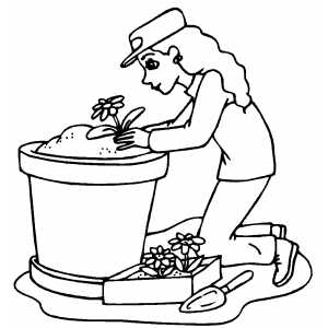 Girl Putting Flower In Flowerpot coloring page