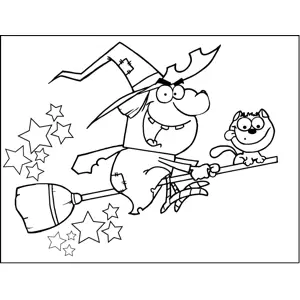 Angry Witch Riding Broom Printable Coloring Page, free to download and print. An angry, yelling witch rides a broomstick with her cute little cat in this printable Halloween coloring page.