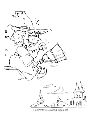 Flying_Witch_With_Crystal_Ball Printable Coloring Page, free to download and print. This Halloween page has a witch flying on her broomstick over a haunted house.