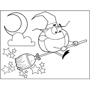Pumpkin on a Broom Printable Coloring Page, free to download and print. Set against a background of stars and the moon, this printable Halloween coloring page features a silly pumpkin in a witch's hat riding a broomstick.