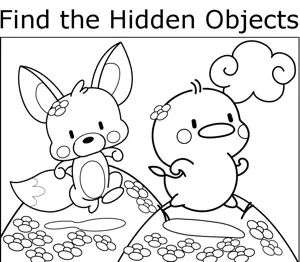 Animals and Flowers Printable Coloring Page, free to download and print. Find the hidden object in this picture of the happy chick and the baby fox dancing among the flowers together.