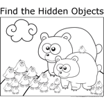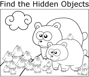 Bears and Birds Printable Coloring Page, free to download and print. Careful viewers can find the hidden objects in this printable coloring picture of bears and birds.