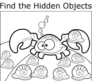 Crab Printable Coloring Page, free to download and print. A number of hidden objects can be found in this printable picture of a crab dancing among snail shells.