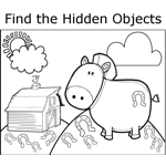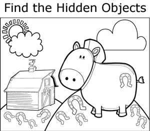 Pig on Farm Printable Coloring Page, free to download and print. Great as a puzzle and a coloring page, this printable picture shows a pig wearing a bell, horseshoes, a farmhouse, and several hidden objects.
