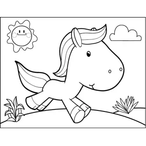 Cantering Horse Printable Coloring Page, free to download and print. The style of this printable animal coloring page is cute and cartoony, and it features a pony running through a field.