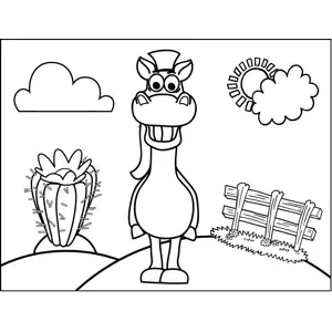 Grinning Horse Printable Coloring Page, free to download and print. A horse stands on its hind legs and grins in this printable animal coloring page set against a backdrop of a cactus and a fence.