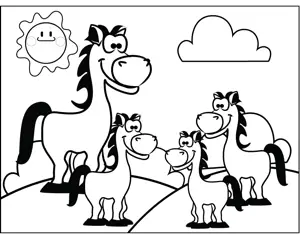 Horse with Foals Printable Coloring Page, free to download and print. There is a horse with three foals standing in a field in this printable coloring page about farm animals.