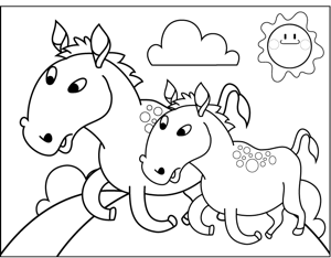 Running Horses Printable Coloring Page, free to download and print. There are two horses running across a hill in this printable animal coloring page for kids.