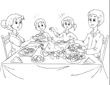 Family Eating Dinner Printable Coloring Page, free to download and print. A happy family of four enjoys a turkey dinner this coloring page for Thanksgiving or anytime.
