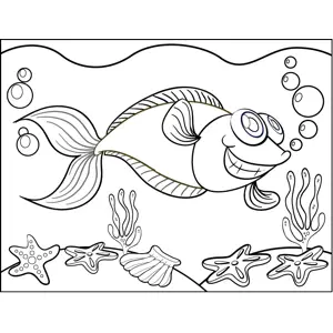 Cheerful Fish Printable Coloring Page, free to download and print. Smiling in a cheerful, nearly manic fashion, the fish in this printable ocean coloring page swims gaily over an ocean bed of starfish and seashells.