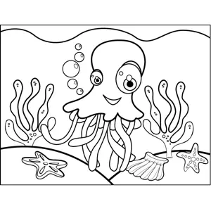 Cute Jellyfish Printable Coloring Page, free to download and print. A cute jellyfish swims amongst coral and shells in this printable sea life coloring page.