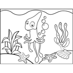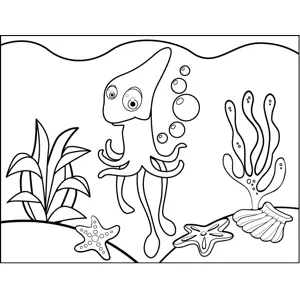 Floating Squid Printable Coloring Page, free to download and print. A floating squid lowers its tentacles onto the ocean floor in this printable marine coloring page.
