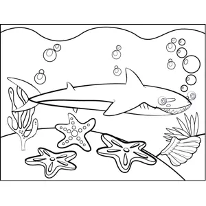 Grinning Shark Printable Coloring Page, free to download and print. The shark swimming through this printable coloring page is grinning as it hunts for dinner.