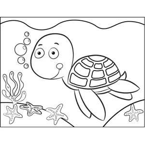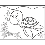 Happy Turtle Printable Coloring Page, free to download and print. A happy turtle blushes and floats with relaxed fins in this printable ocean coloring page.