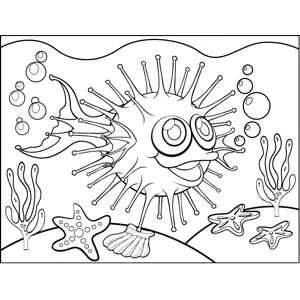 Round Spiky Fish Printable Coloring Page, free to download and print. A round, spiky puffer fish extends sharp spikes in this printable ocean coloring page.