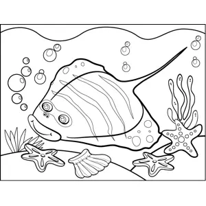 Striped Stingray Printable Coloring Page, free to download and print. A striped stingray floats over shells and sea life in this printable marine coloring page.
