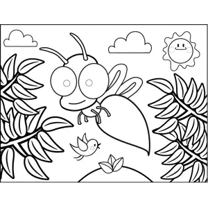 Bug in Branches Printable Coloring Page, free to download and print. A flying bug with a big stinger buzzes through leafy branches in this printable insect coloring page.