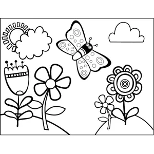 Butterfly in Flowers Printable Coloring Page, free to download and print. The butterfly in this printable insect coloring page has lots of spotted patterns and is flying over a field of pretty flowers.
