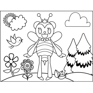 Cute Excited Bee Printable Coloring Page, free to download and print. This printable insect coloring page is decorated with flowers and trees and shows a cute, happy bee wearing a pretty pearl necklace.