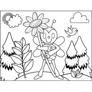 Fly with Flower Printable Coloring Page, free to download and print. A happy fly smiles and hugs a big flower to its chest in this printable insect coloring page for young artists.