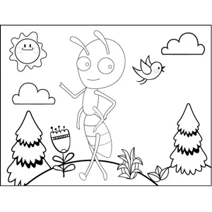 Proud Grasshopper Printable Coloring Page, free to download and print. This printable insect coloring page shows a proud grasshopper walking through a field of flowers and waving.