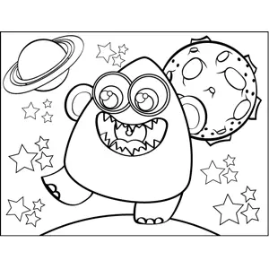 Dancing Monster Printable Coloring Page, free to download and print. This printable coloring page features a happy monster with big ears and sharp teeth dancing on an alien planet with a background of stars.