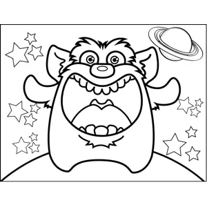 Excited Monster Printable Coloring Page, free to download and print. The hairy monster in this printable outer space coloring page is yelling and waving in the middle of a starry sky.