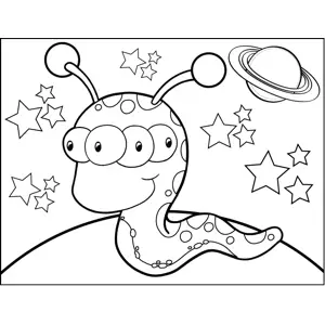 Four-Eyed Space Slug Printable Coloring Page, free to download and print. A spotted alien slug with four eyes and antennae oozes its way across a planet in outer space in this printable monster coloring page for kids.